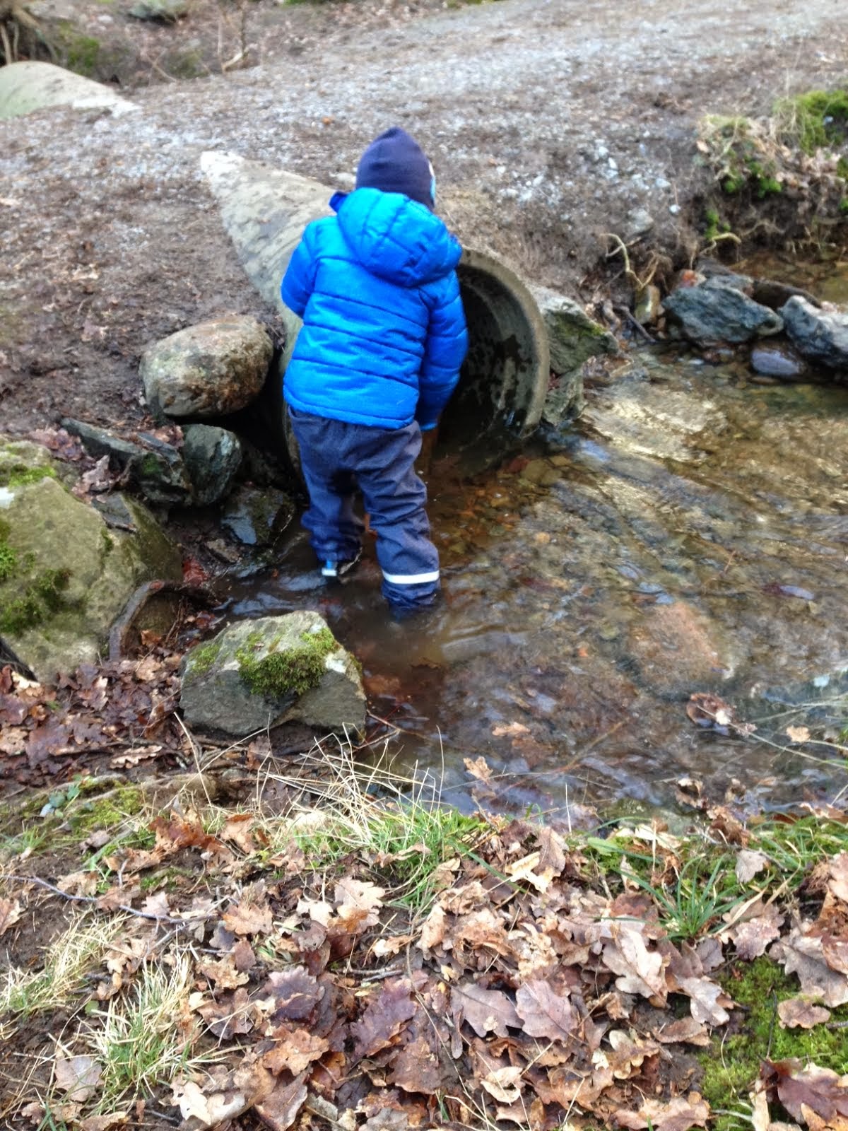 Vikten av bra kläder och skor… Men här hjälper inget annat än vadarstövlar. När vi åker hem är han pisseblöt och täckt av lera. Precis som det ska vara när man är fyra år. Eller 33. 🙂 Av med ytterkläderna, skor, strumpor och åka raka vägen hem.