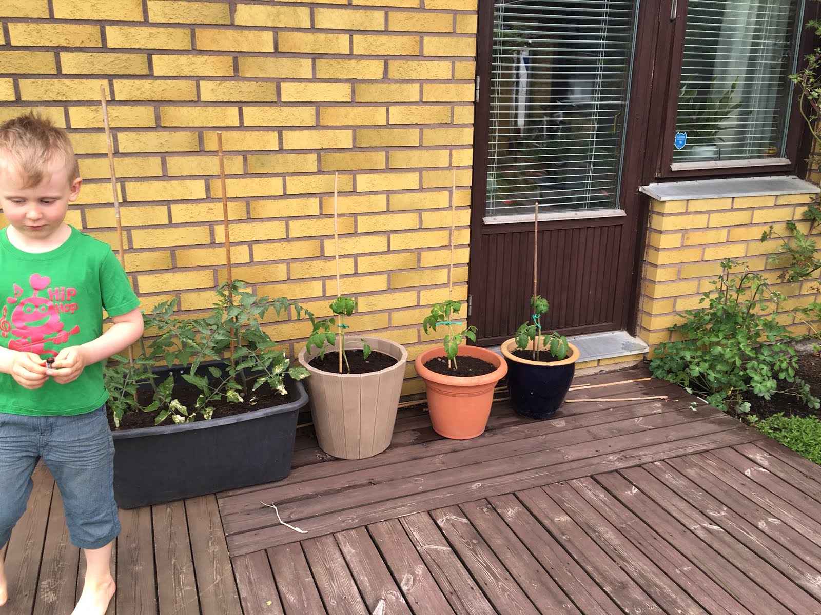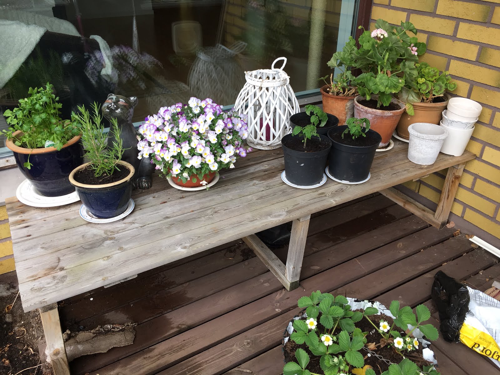 Pelargonerna är fortfarande små inne i hörnet, men de kommer sig snart. Här står även tre tomater vid namn Tiny Tim som idag fick större krukor. En busktomat med små röda körsbär som är ny för mig. Igår köpte jag slätbladig persilja, timjan och rosmarin. Persiljan ställer jag på två fat med tösalt på det understa. Annars tar det en natt så har sniglarna ätit upp dem. Persilja är tydligen en första klassens delikatess. 🙂