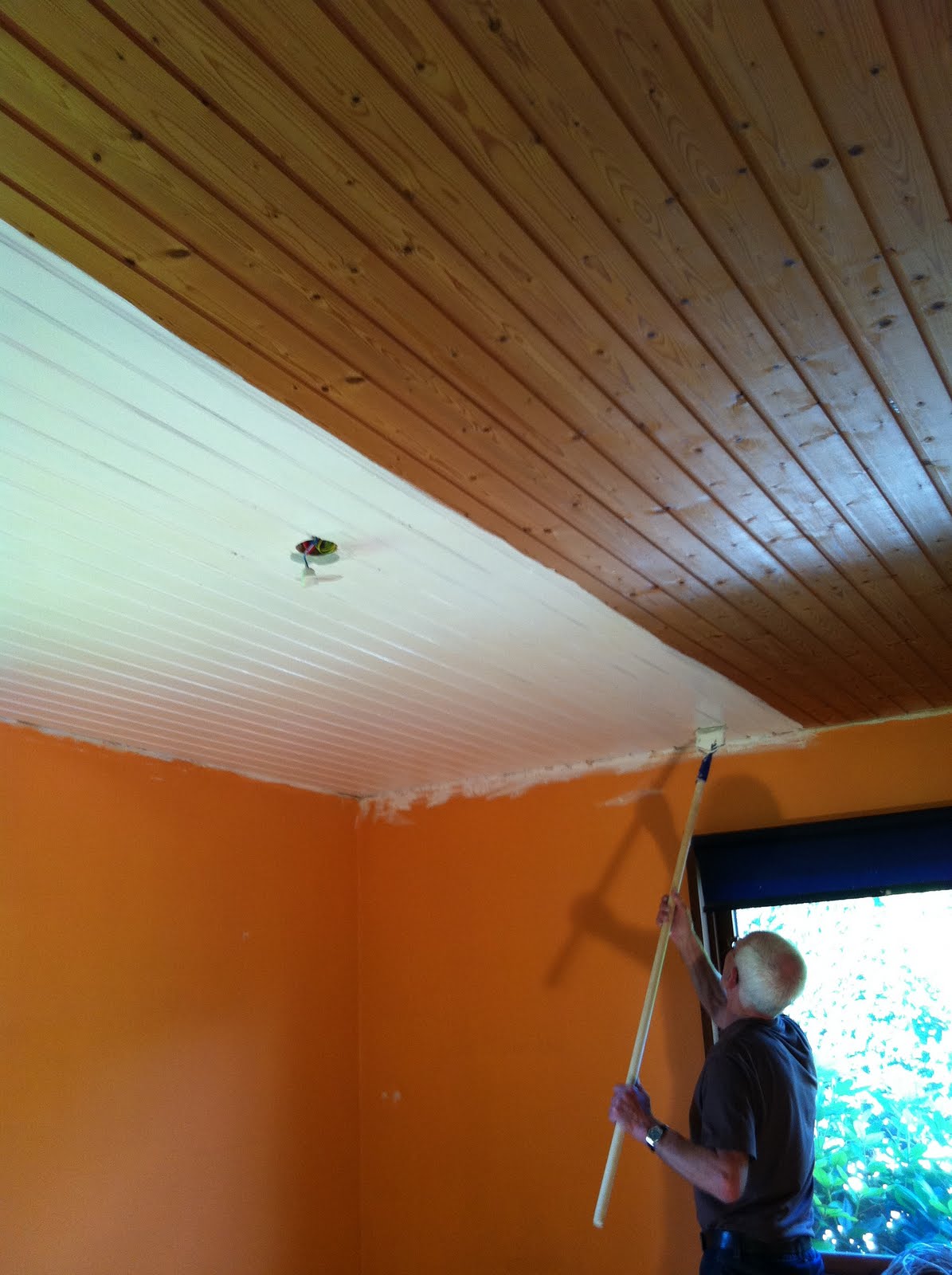Jag går först och målar mellanrummet med liten pensel så rollar och stryker far efteråt. Satan vilken mjölksyra det ger!