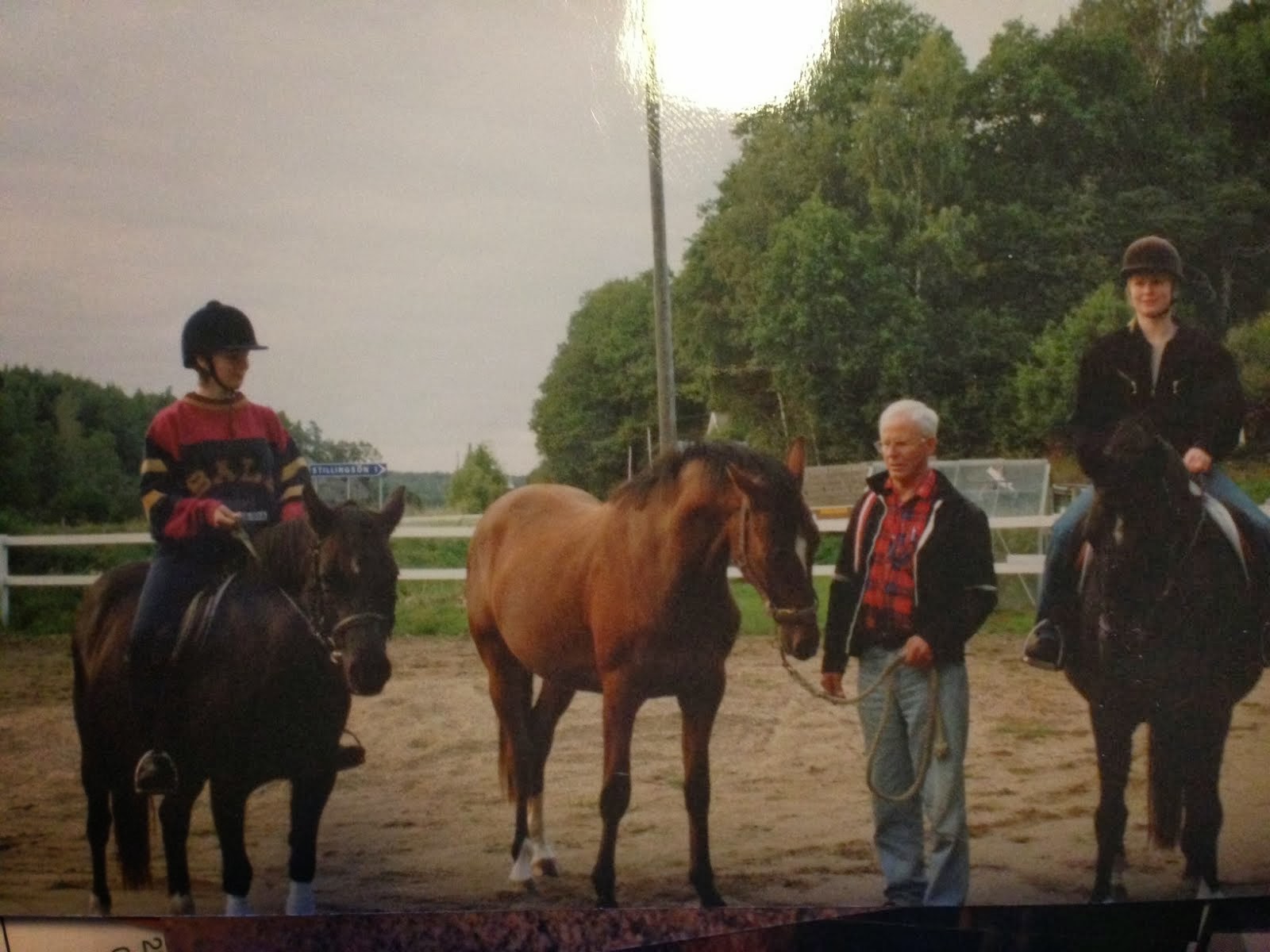 Jag gissar att det är år 1996. Wille som står i mitten med min far ser ut att vara ca två år. Till vänster sitter Snäckan på min första ponny Zenita. Till höger sitter jag på Willes mamma Geisha. Lite kul att hitta en bild som denna.
