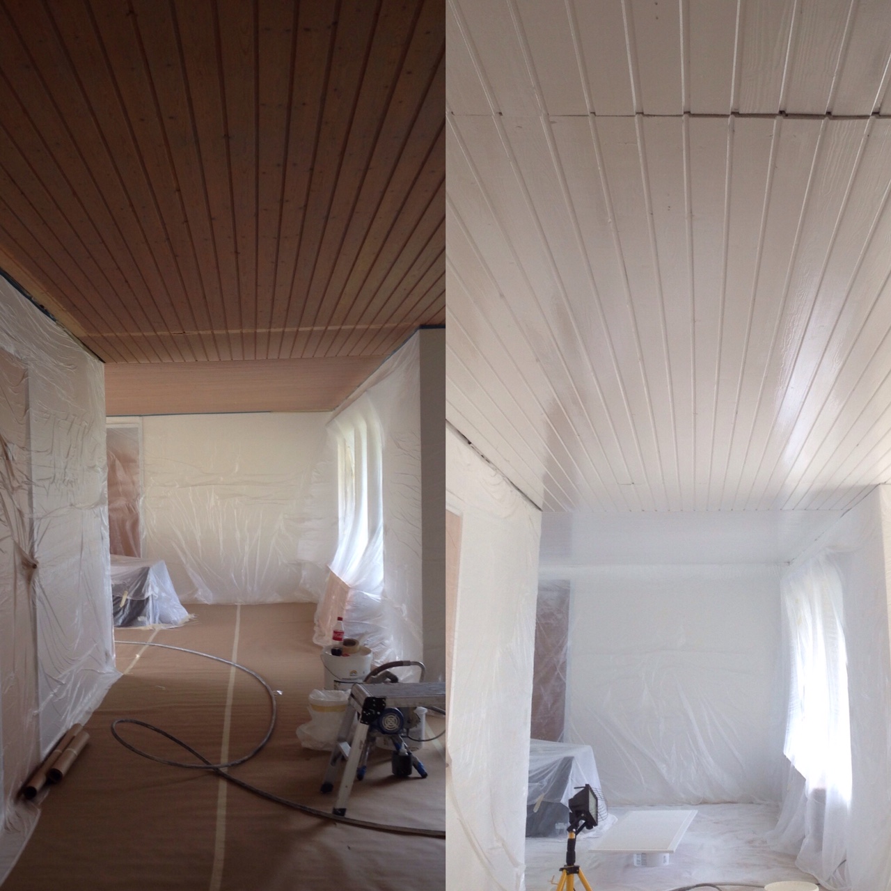 Det är nu lördag förmiddag. Taket har just målats för femte gången. Tydligen är målarnisse väldigt missnöjd med hur färgen täcker. Kul…