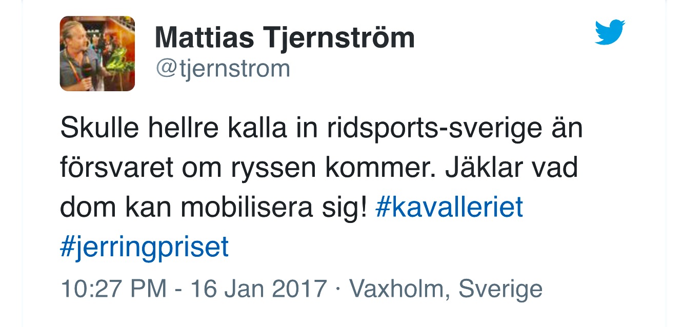 Peder Fredicson vann Jerringpriset. Bittra sportreportrar ger den ena trista kommentaren efter den andra. Jag bara ler. Jerringpriset är just folkets pris. Vi hästnördar har vår sport väldigt nära hjärtat. Hur skulle vi annars orka med allt slit som det innebär att vara ryttare? Det är dessutom en annan varelse med i bilden. Våra underbara hästar. (#twohearts) Ingen boll, klubba eller bensindriven motor som man kan ställa undan när det tar emot. Så släpp lös era bittra kommentarer. Det gör mig ingenting. Peder (och därmed ridsporten) fick sitt fina pris. Vi gjorde det tillsammans!