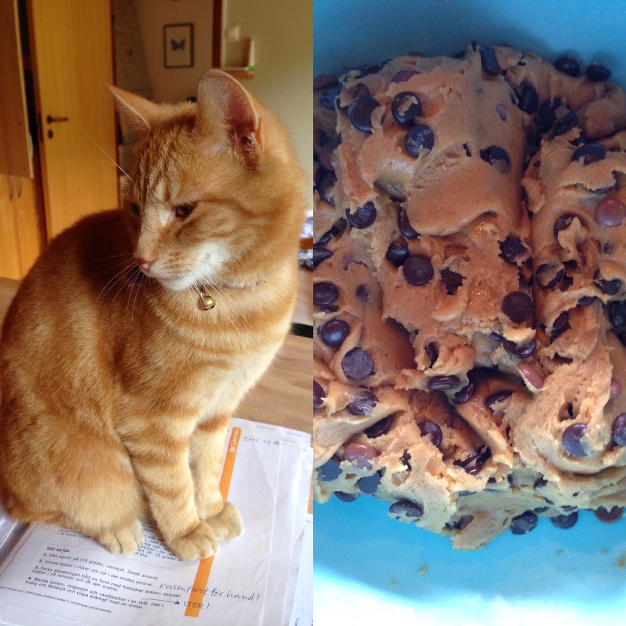 Jag har varit sugen på chocolate chip cookies i säkert en vecka. I lördags var det äntligen dags. Otto “hjälpte till”. Såklart. Är det genetiskt inpräntat att katter ska sätta sig på saker vi människor läser?!