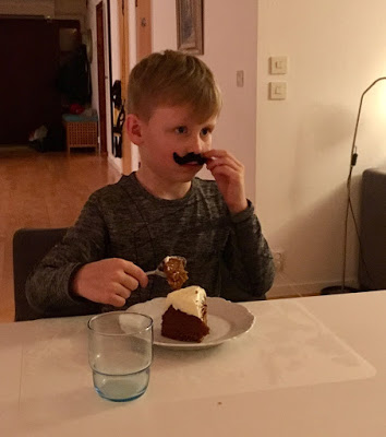 Mycket mäktig kaka men den var omtyckt av alla. Även hos den lille mannen med mustasch. Faster K vet vad man ger en sexåring. KJ lagade god kyckling och det var ingen som la sig hungrig.