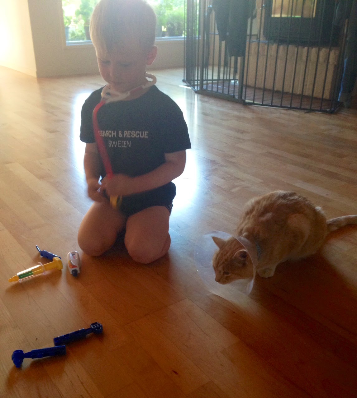 I lördags natt dök Karl-Oscar upp, la sig i min säng och ylade. Trodde först vi fått in en inkräktare men insåg snart att han hade ont. Mycket ont. KJ fick dra iväg till Blå Stjärnan och som tur var tog de emot honom direkt. Raka, tvätta och spruta. Kattbett. Såklart. Nu hoppar han på tre ben och är sååå olycklig. Det är för fint väder för att vara inne. Och gå på kattoalett är ju det värsta av allt. Blä!