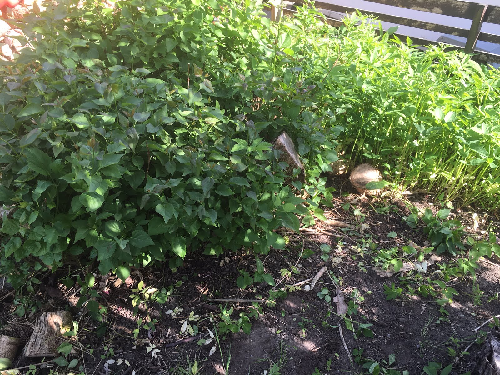 Far sågade ner en jättesyren för oss förra året. Den växte över till grannarna och vår bod så det var lika bra att ta i rejält. Nu håller den på och växer upp igen. Och med ljuset så fick även kirskålen fart. Som f*n. Nästan lika hög som syrenen. Jag har rensat i två dagar och har fått det mesta. (På bilden har jag rensat framför.) Men rötterna… Hur vet man vad som är ogräs eller odlad blomma? Dra upp den. Bryts plantan av vid roten är det ett ogräs. Det är min rent amatörmässiga analys. Inte att tas på för stort allvar. 🙂