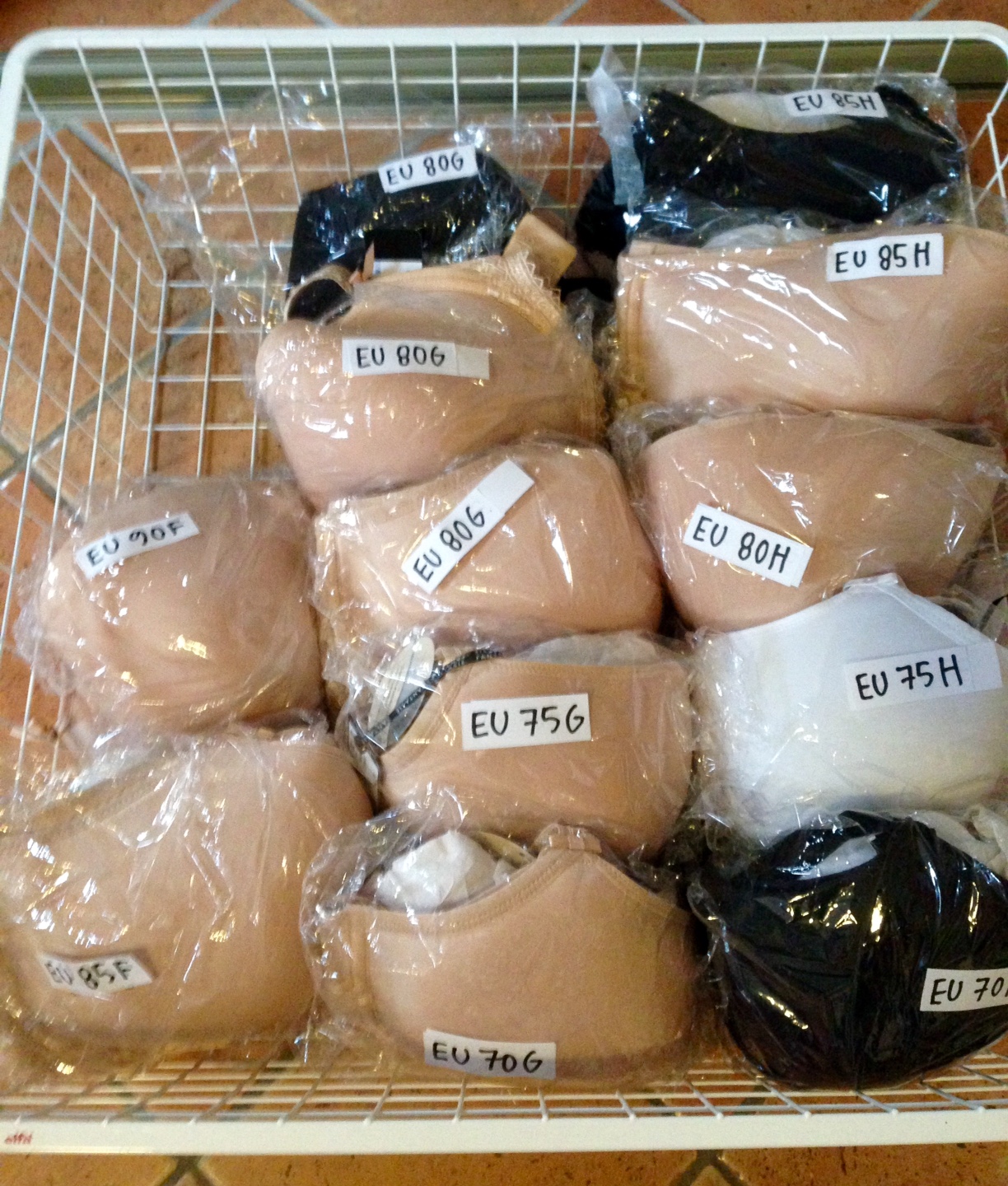 Alla Freya, Fantasie och Elomi ska märkas om. EU-kuporna har numera inga dubbelbokstäver. Etiketterna måste hänga på. Så jag skriver och klistrar. Gillar när det är tydligt och ligger i ordning. Så här ser det ut nu. I en korg. 🙂