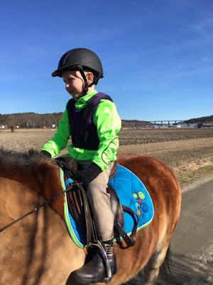 Hem och tanka lite lunch innan ridskolan. Giffe fick ställa upp på promenad i finvädret.