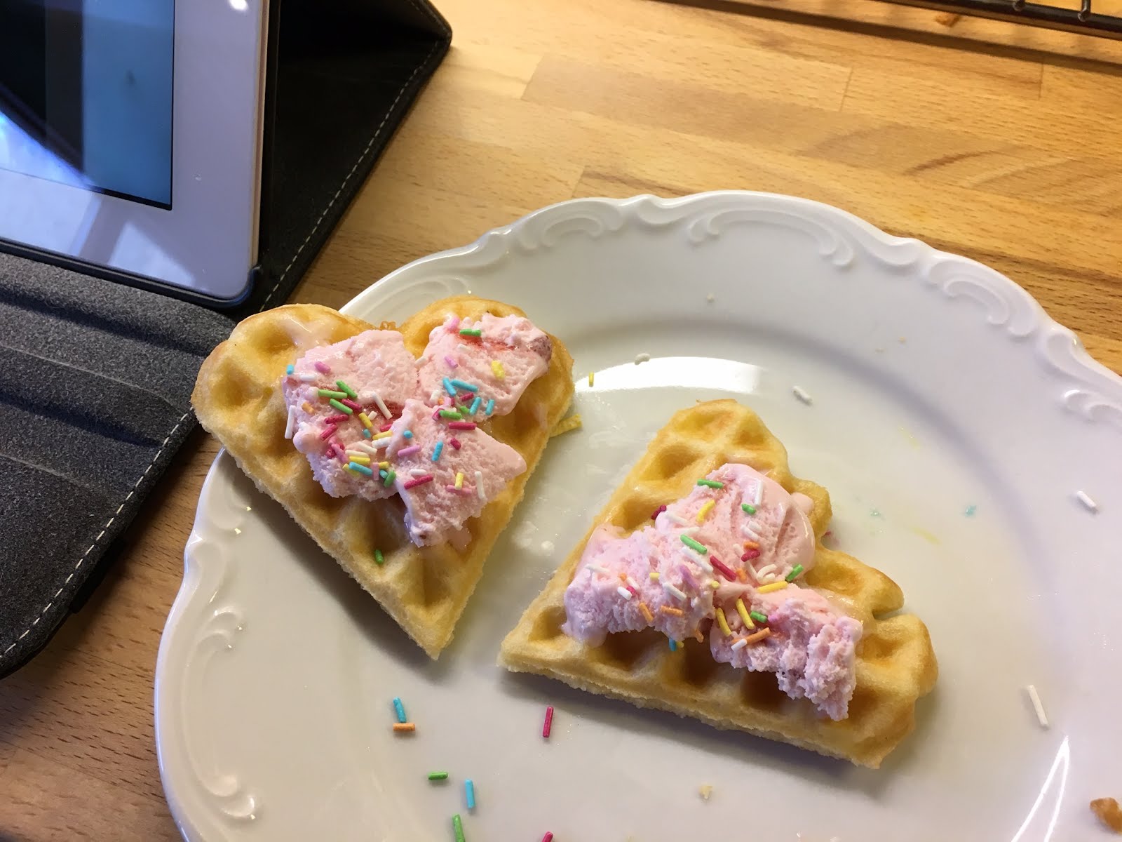 Våffellunch med jordgubbsglass och strössel. Allt för att det ska ätas lite. Använde många ägg och dinkelmjöl, inbillar mig att det är lite bättre än vanligt vetemjöl. Barnet fick energi och piggnade till lite.