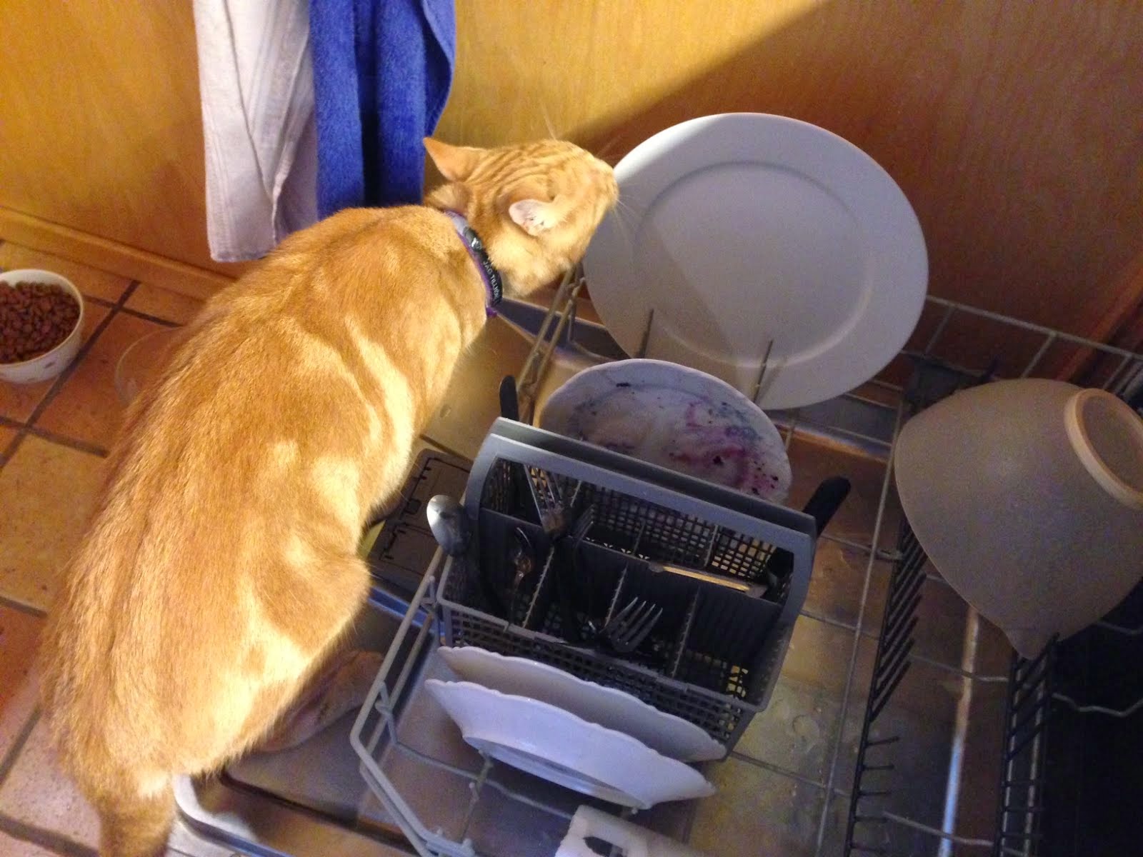 Lilla röda skitsvansen kom på något nytt i går. Man kan sörpla lite i diskmaskinen om man inte får slicka på saker på köksbänken. Skitsmart.