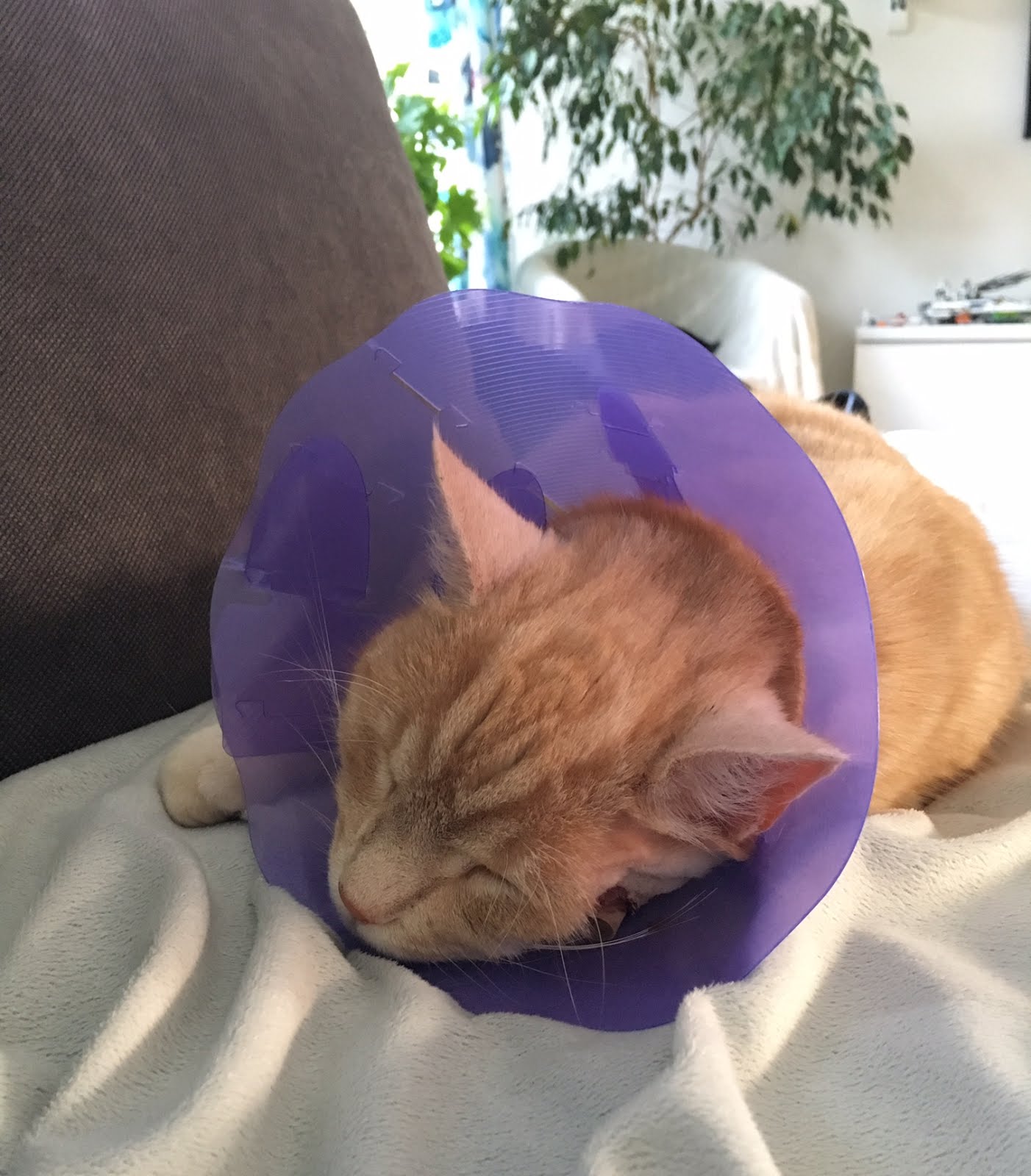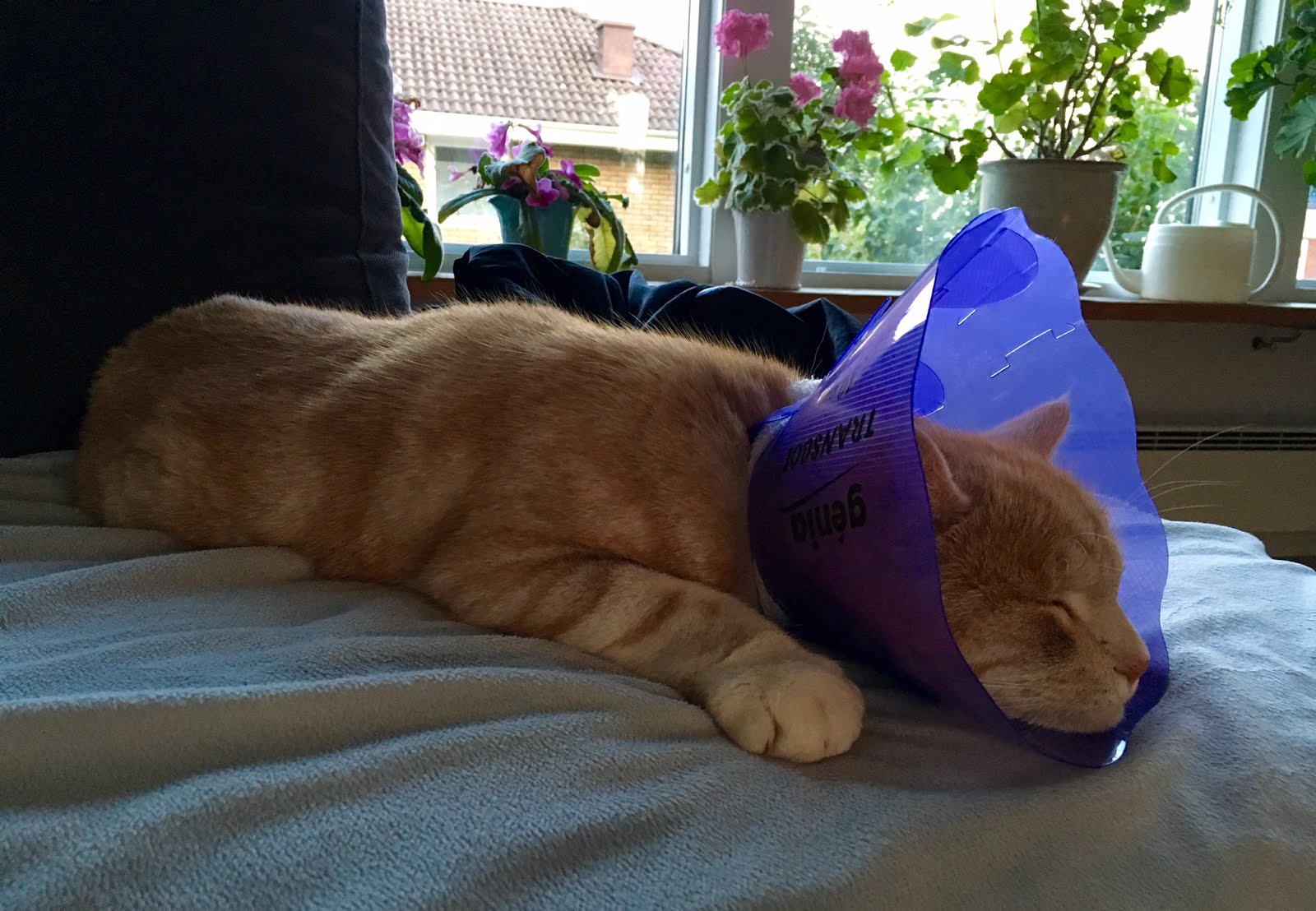 Här är en gubbe som lider. Tror inte han har superont. Men bara det att få en tratt runt skallen och inte få gå ut. Det är brutalt för den här kattkillen. Nu har han äntligen gått och lagt sig. Har vandrat runt och kurrat och pratat med mig hela dagen. Fjäskat för att få mig till dörren.