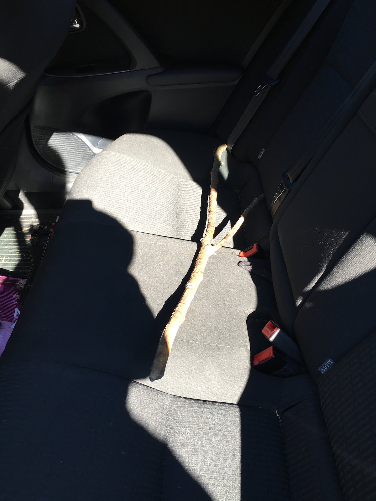 Han fick hänga med till stallet och hittade självklart en pinne. Som åkte med hem. När lyckades han få in den i baksätet?!