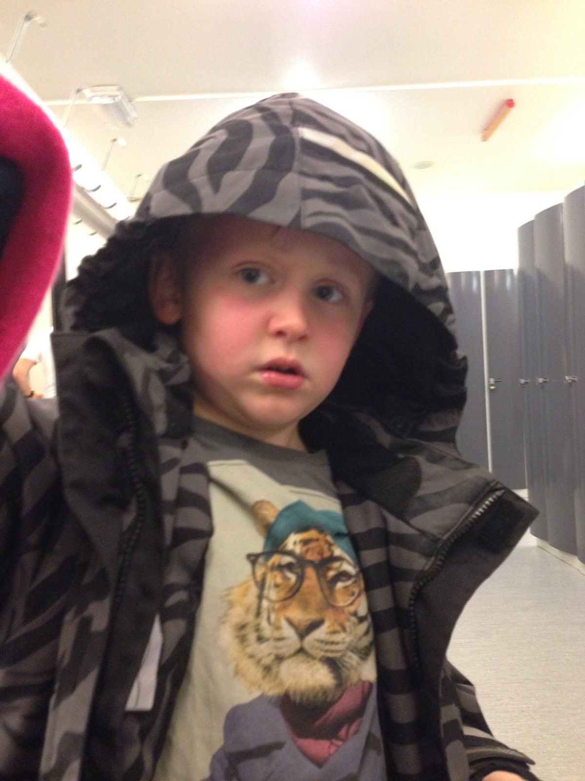 Idag blev det simhallen. Bus var mer under än över ytan. Hoppade som en tok från kanten. Här är han bastuvarm om kinderna. Han gillar bastun bättre än mig. Andas varmluft är inte min grej. Sedan blev det slasklunch och en tur till torget. Några fler julklappar inköpta. Nu är jag helt slut. Har en kund kl 15 och sedan ska vi slappa delux.