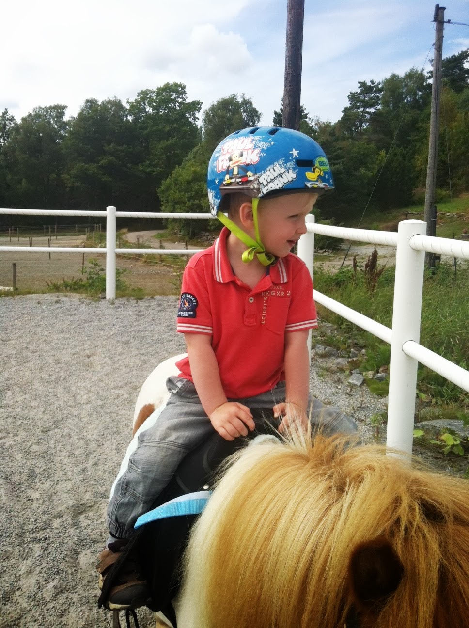 Efter en mysig lunch hos mormor Astrid igår så åkte vi till stallet. Det har pratats mycket om att få rida på Sixten. Stallets lilla tjocka shetlandsponny. Buset borstade så fint och red först några varv i paddocken. Lärde sig hur man stannar och sätter igång. Kan meddela att Sixten fick göra mååånga övergångar igår. Tålmodigt litet djur. 🙂 Vi gick även en sväng på den lilla grusvägen men det gick väldigt långsamt där. Inget Buset brydde sig om. Han fortsatte göra “övergångar” och pladdra på om allt och inget. Söta skitungen.
