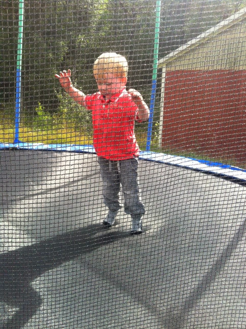 Sedan fick han syn på studsmattan. Frågade om lov och hoppade, hoppade och hoppade. Minst en timma höll han på. Jag hade aldrig orkat! 🙂