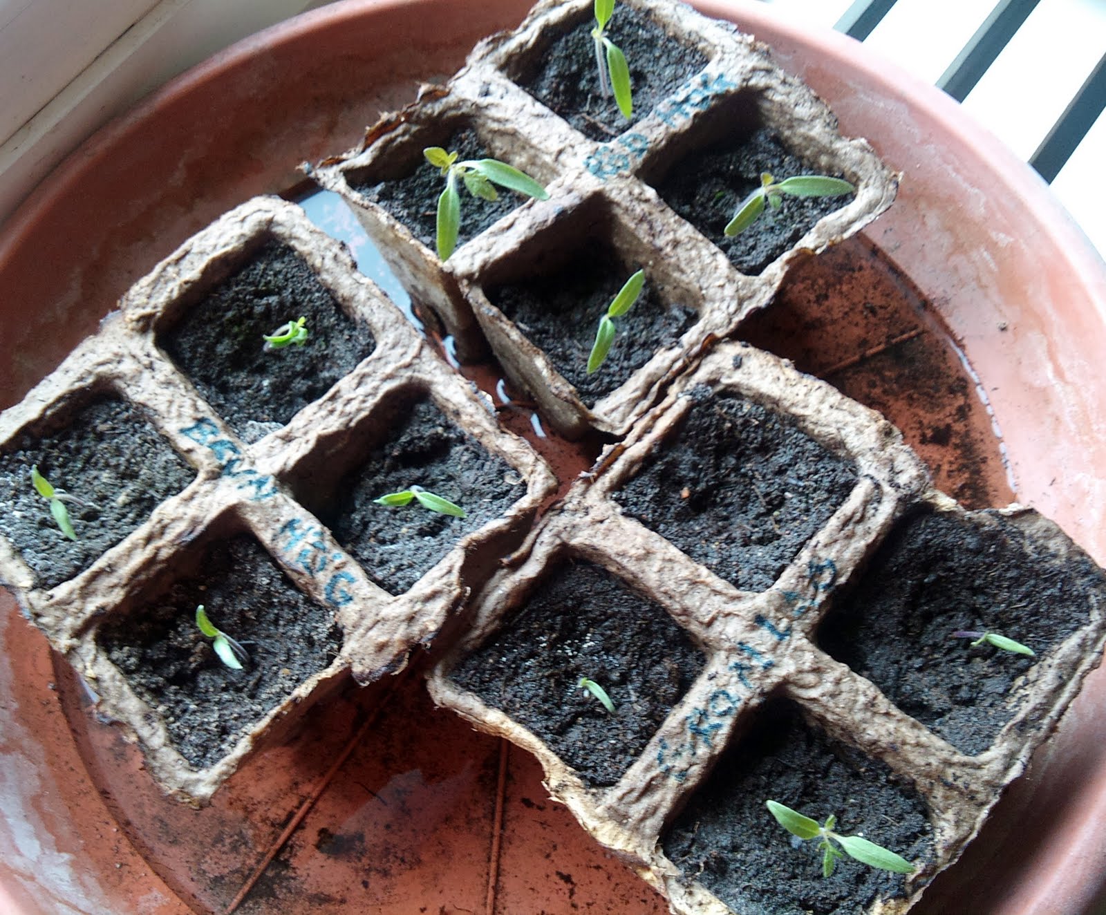 Alla utom en har dykt upp. Blir alltid för många hur man än gör. Tänkte köpa en färdig planta så vi får tomater lite tidigare på säsongen. Är lite sen i år. Planen är att ge ett par plantor till mormor. Hon kan säkert ha dem på balkongen.