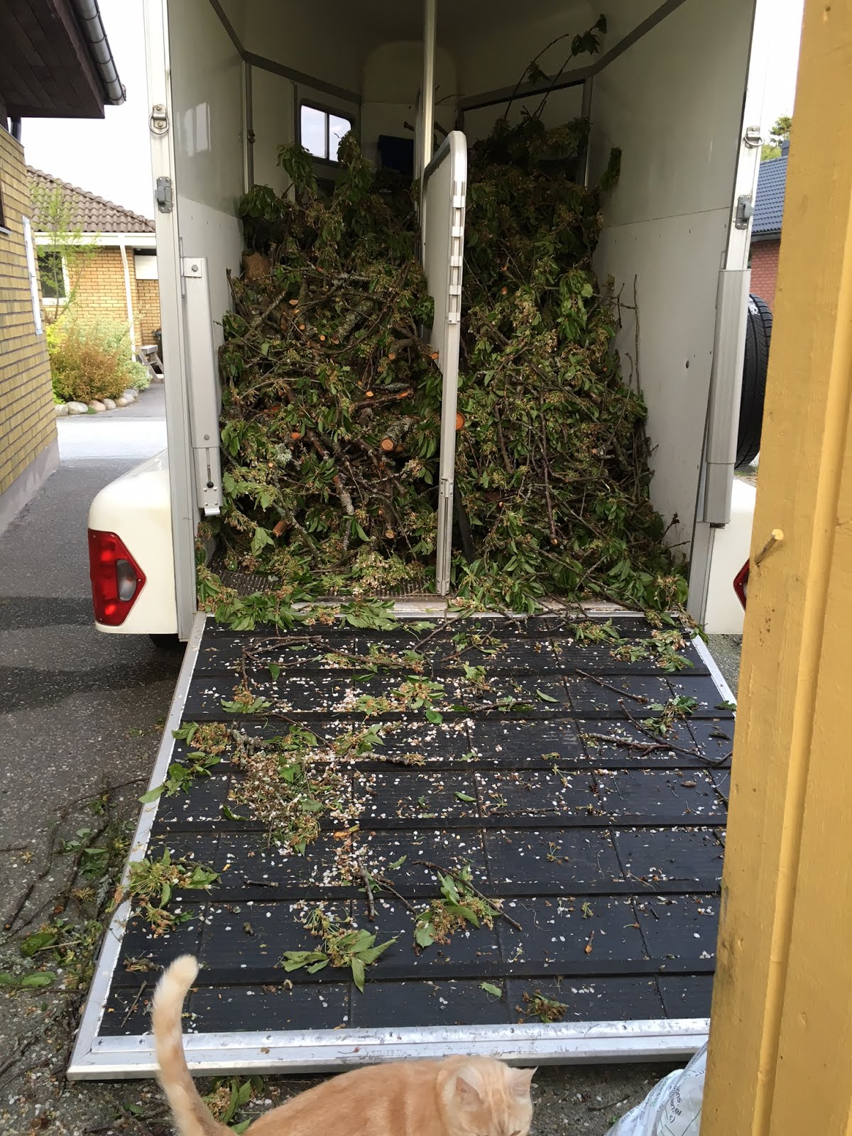 Förstår inte hur bra det sjönk ihop när vi lastade. Kommer bli intressant att lasta ur. Vresigaste grenarna jag har jobbat med. Jag har ju kört iväg ett antal rhododendronbuskar och mängder med syrener. Detta är stretigast av dem alla. Grenarna pekar åt alla håll och sätter sig fast i allt. Får se om det blir dagens lunchträning att lossa på tippen.