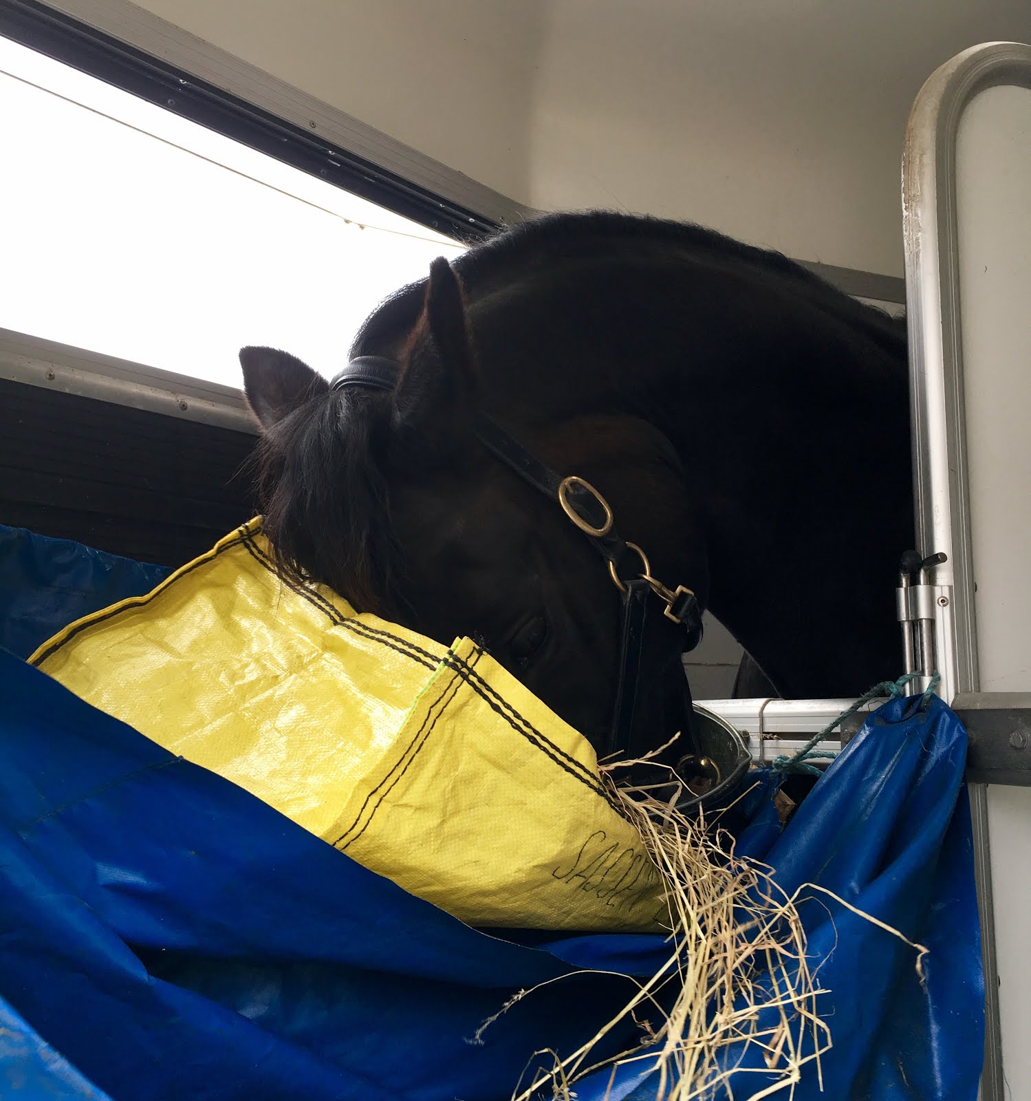 Vi är ju anmälda till årets första start om några veckor. Kände att jag behövde lämna väggarna innan dess. Så vi åkte till väninnan M:s gård. Sass var helladdad. Men när hon gått några varv i paddocken lugnande hon ner sig. Hon har ju bott på gården så hon kände väl igen sig efter en stund. Kanske inte så utmanande att åka dit men det är alltid trevligt att träffa kära vänner. Hon jobbade på fint. Några stabila halva piruetter, byten upp till tvåor och jobba med att komma tillbaka i traven och länga några meter. Duktig pålla. På bilden äter hon sitt gottis i form av lusern efter passet. Hon bara älskar sin lusern.