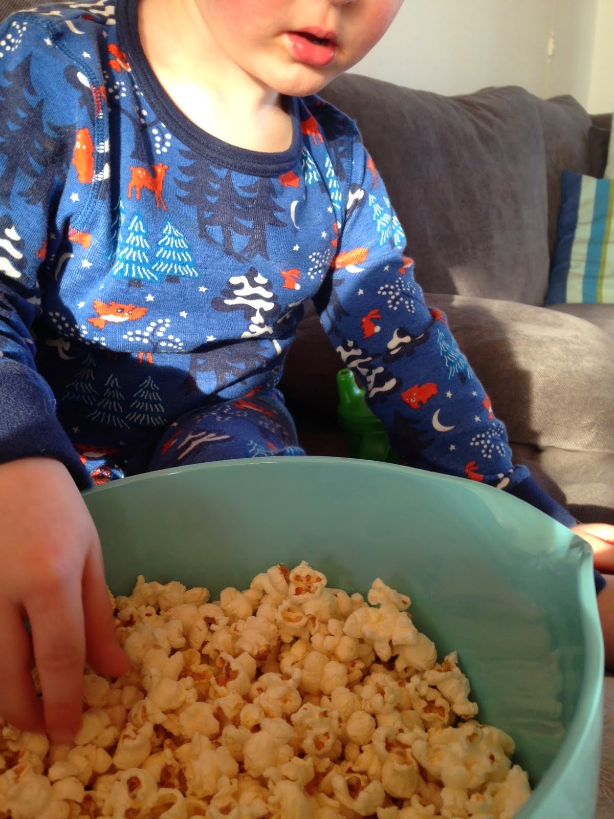 Idag är energinivån lite låg. Då är det extremt skönt med vår nya tradition. Tecknad film, popcorn och “päronjuicevatten”. Loka Crush päron är så god! Känns väldigt mycket bättre än saft och Buset tycker det är gott.