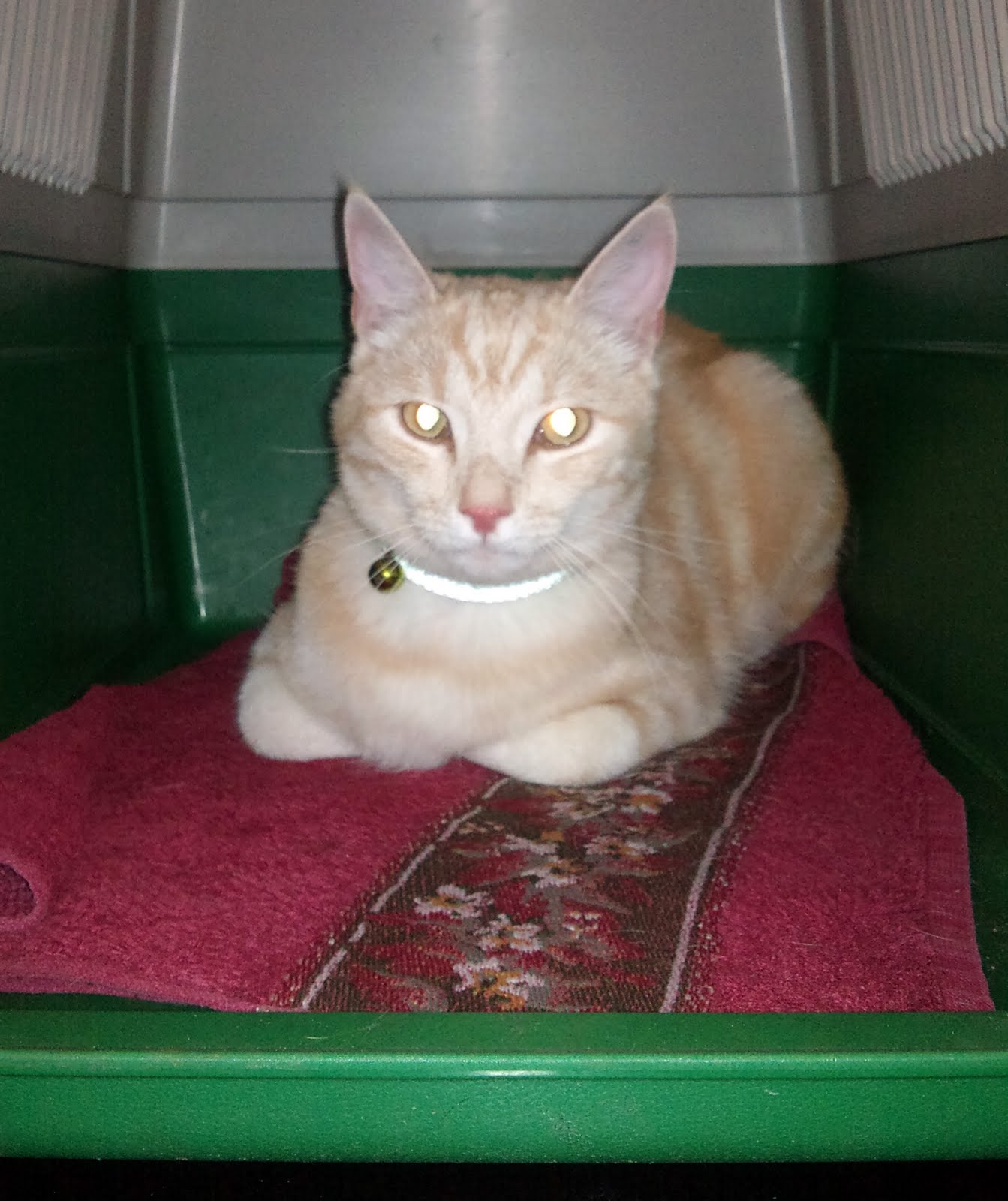 Var till veterinären på återbesök idag. Lille Kalle-Oscar blev biten av en huggorm för tre veckor sedan och det var dags för återbesök för att kolla njurar och lever. Han spinner när vi kommer dit. Han spinner när han blir inpackad i en handduk och får en svart huva trädd över ansiktet. Spinner när hon rakar hans ben och tappar honom på blod. När allt är klart så kliver han tillbaka in i sin resebur och lägger sig tillrätta igen. Och spinner. Han måste vara världens snällaste katt.