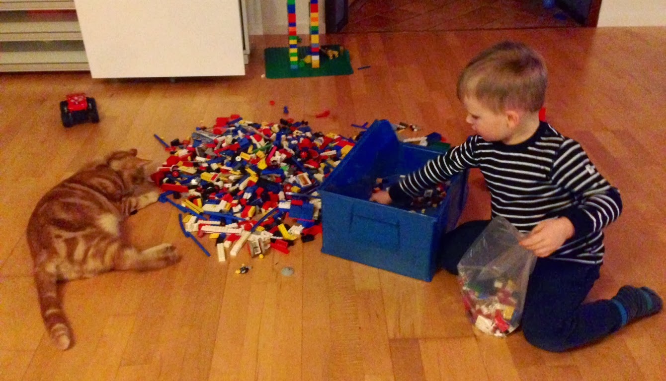 Fick en låda med blandat lego idag. Men jag tror vi fortsätter med duplo ett litet tag till. Pyttebitar överallt. Ottokatt hjälpte gärna till och spred ut dem. Buset blev om möjligt ännu surare på honom. Annars är det hosta och snor sedan igår. Men ingen feber så han kämpar på bra med lek och mat. Och så får man saft när man är förkyld. Lär få bli dubbla nattblöjor. 🙂
