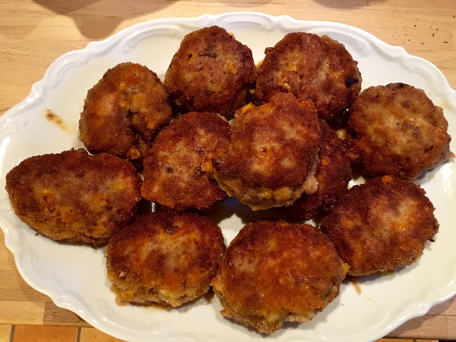 Efter lunch kom mor och far för middag. Jag lagade cornfritters, färsbiffar med majs som är panerade.